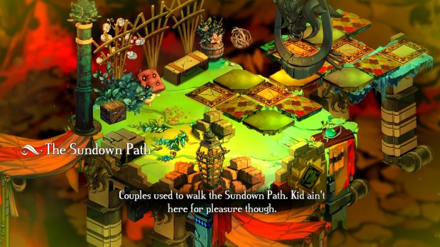Bastion’s world is uncovered while you move. As The Kid is progressing through a region, the ground is literally flying up and forming in front of him as he’s walking. It gives the story, and the game overall, somewhat of a storybook quality.